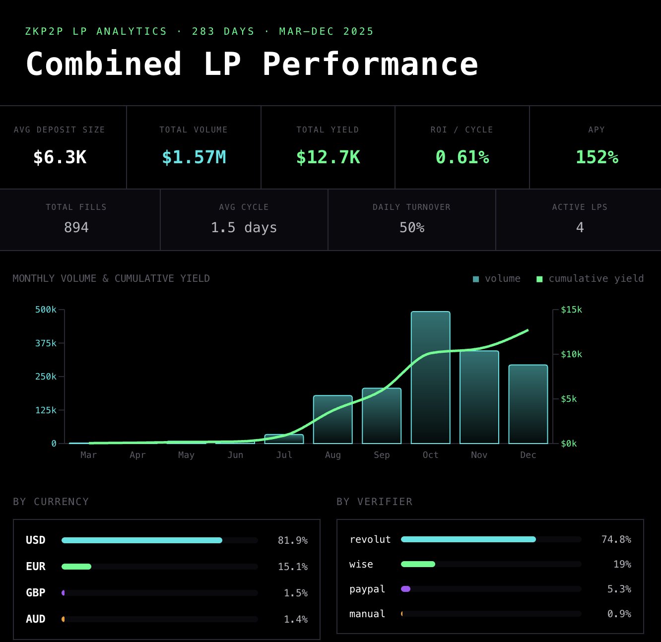 In March, you could charge 2-3% spread on EUR and 1.5% on USD quite easily; they have compressed to 0.5-1% as competition increases. That is not a problem; the market is maturing and there is still plenty of money to be made. More liquidity leads to tighter spreads. Tighter spreads lead to more users. More users lead to more volume. More volume leads to more yield for liquidity providers, even at lower margins. ZKP2P processed over $20M of volume in 2025, and the volume will only continue to increase in 2026.