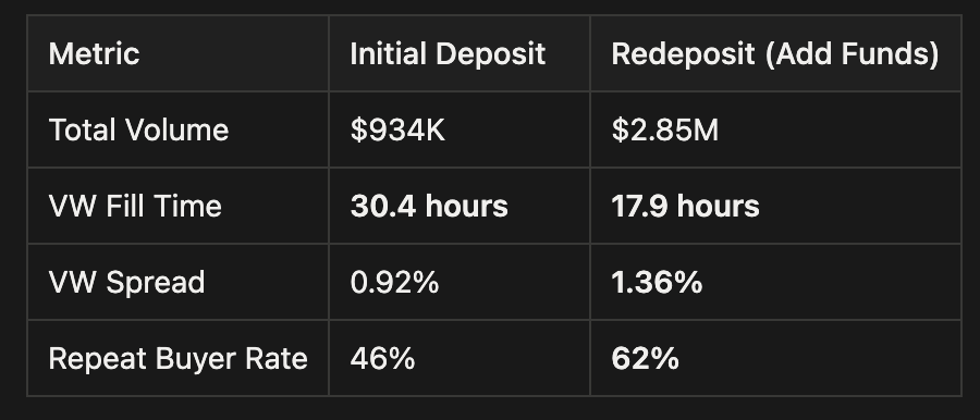 The most interesting insight, LPs who redeposit fill 12 hours faster, and earn higher spreads than first-time depositors.
