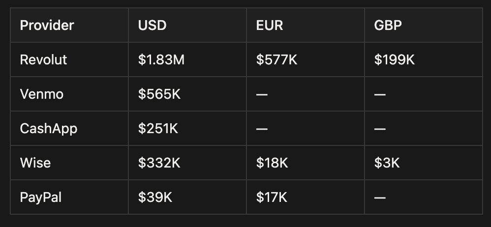 Revolut dominates the volume, capturing 67% of the flows, helped by the fact it is multicurrency. This, however, doesn't tell the full story. Liquidity providers care about two things: