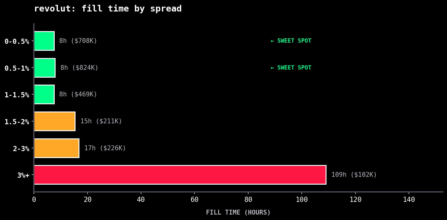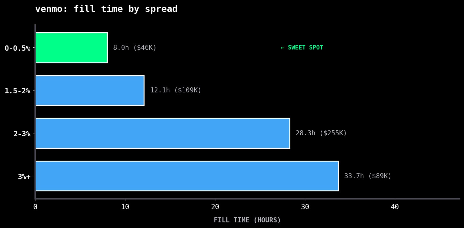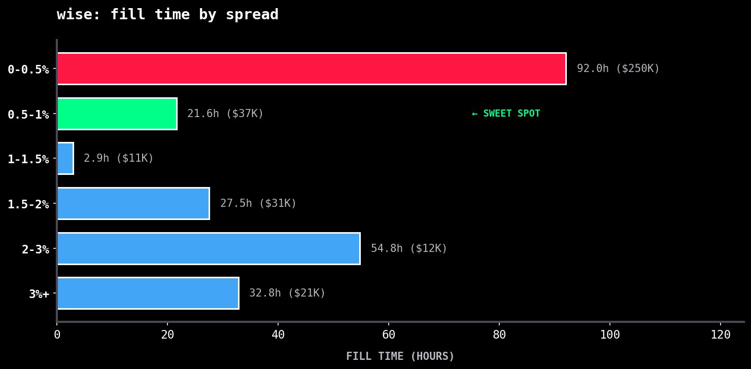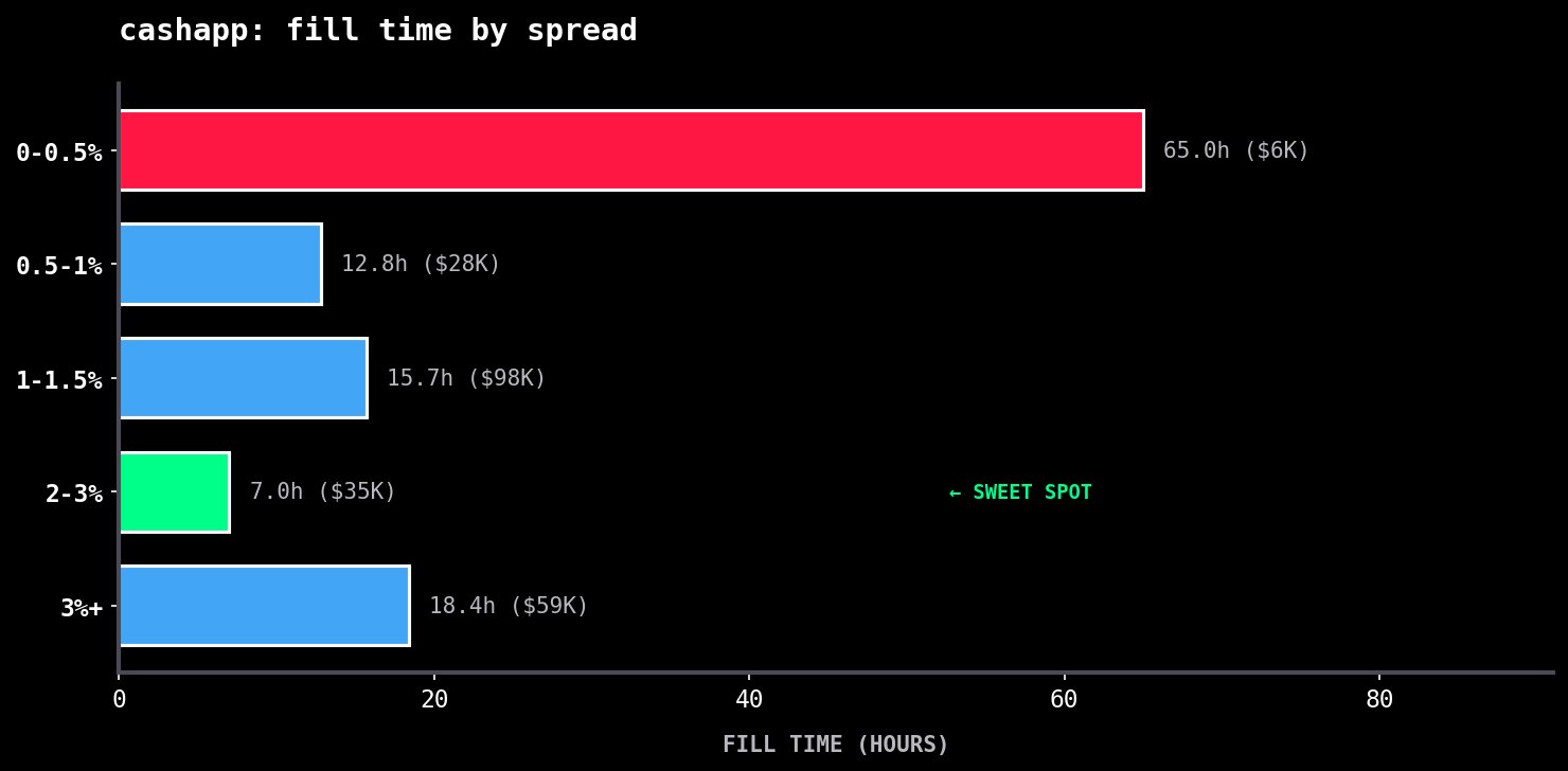 Everyone wants to know the optimal spread, so I've bucketed the transactions by spread range and calculated the volume-weighted fill times: