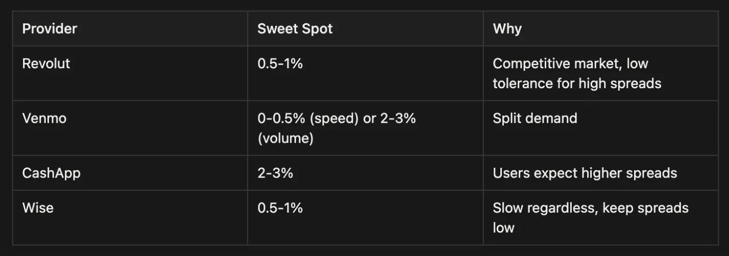 Each provider has different dynamics and nuances. Cash App's sweet spot is between 2-3%, the same spreads would be toxic on Revolut.