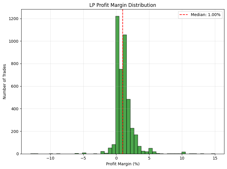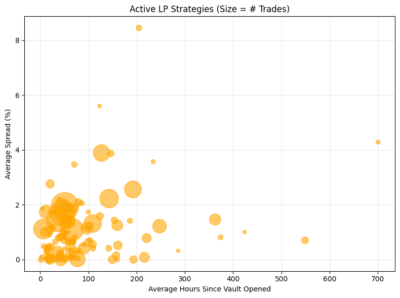 Volume is distributed across a range of liquidity providers, with no single entity dominating, signaling a healthy and dynamic liquidity landscape. Smaller LPs are still getting filled, but the game is significantly tighter and the wait time can be longer. This also means that profit margins are all over the place, single trades making between -13% and 15% in profit, the majority of LPs fall into the 1-2% range. Long tail profits exist, but LPs strategy needs to be able to take advantage of them.