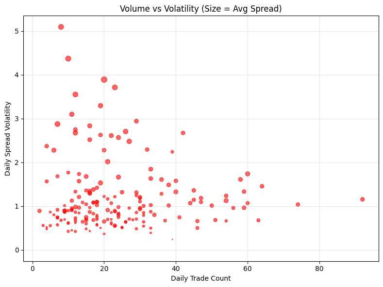 - There is a weak correlation between speed and spread (r = 0.14). Quick trades can be cheap and slow trades aren't always profitable.
