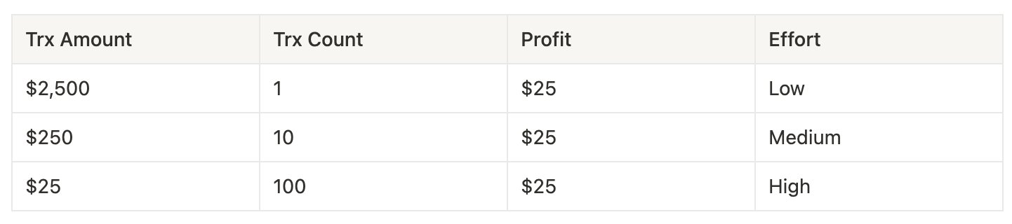 - Bigger trades get better deals, whilst trades of $500 or lower face higher spreads due to perceived effort vs reward.